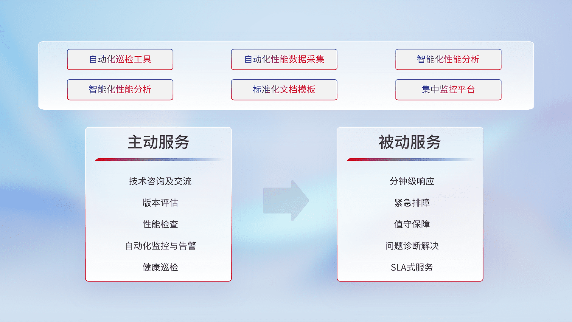 智能化工具和标准化文档,,,保障服务质量,,提供主动服务(包含技术咨询、、、、版本评估、、、性能检查、、自动化监控与告警、、、健康巡检)和被动服务包含(分钟级响应、、紧急排障、、值守保障、、、问题诊断解决、、、SLA服务)。。。。