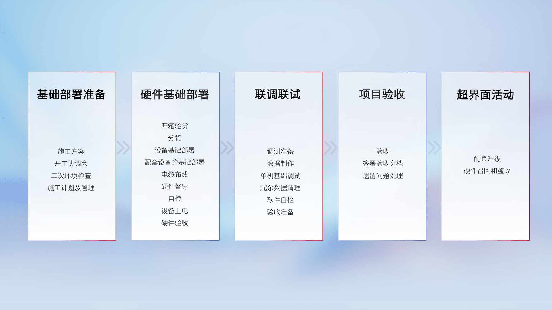从基础部署准备、、硬件基础部署、、、联调联试、、、、项目验收、、、越界面活动的全过程可追溯,,保证施工质量和进度。。。。